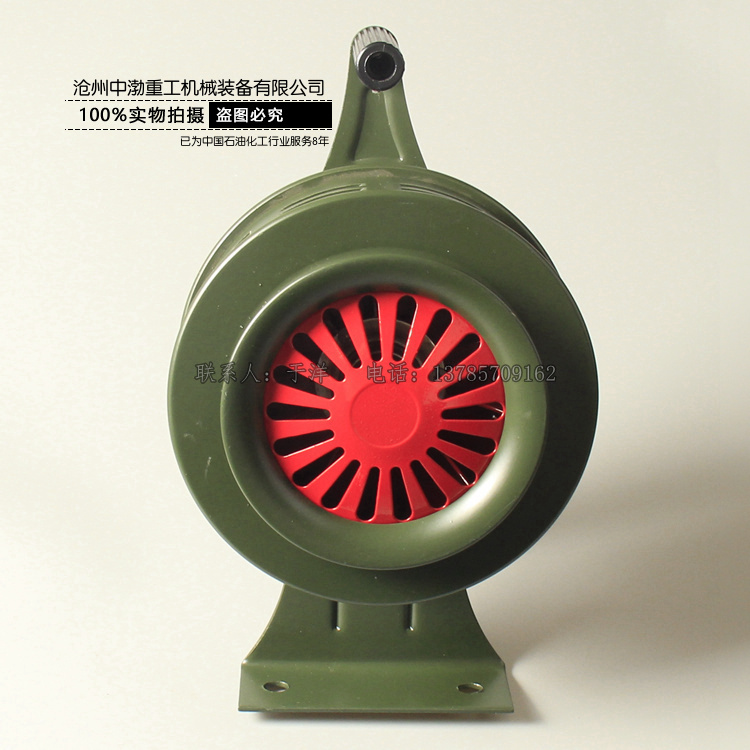 手搖警報(bào)器無(wú)需電源,可 以在無(wú)電源支持的都場(chǎng)所提供一種有效的報(bào)警。只需通過(guò)人工用手順時(shí)針?lè)较驌u動(dòng)手柄,速度達(dá)到初級(jí)(50-80轉(zhuǎn)/分)就可達(dá)到理想的報(bào)警效果,發(fā)出的聲音 尖銳,震撼力大、穿透力強(qiáng)。警報(bào)聲音大小取決于手柄搖動(dòng)的速度,新款手搖警報(bào)在音窗口設(shè)置檔板快門(mén)機(jī)制,可以迅速關(guān)閉音窗口,阻斷聲音,產(chǎn)生不同的信號(hào)。 (老款產(chǎn)品不具備此項(xiàng)功能!)手搖警報(bào)器體積小、重量輕、便于攜帶、安裝方便,不需要任何工具。只需0.15平方米的面積和人站立的地方就可以正常操作 了,流動(dòng)性作業(yè)非常強(qiáng)。民防、部隊(duì)、看守所、監(jiān)獄、礦山、機(jī)場(chǎng)、草場(chǎng)、油庫(kù)、倉(cāng)庫(kù)、賓館、酒店等企業(yè)單位在發(fā)生危急情況下使用的一種理想報(bào)警設(shè)備。